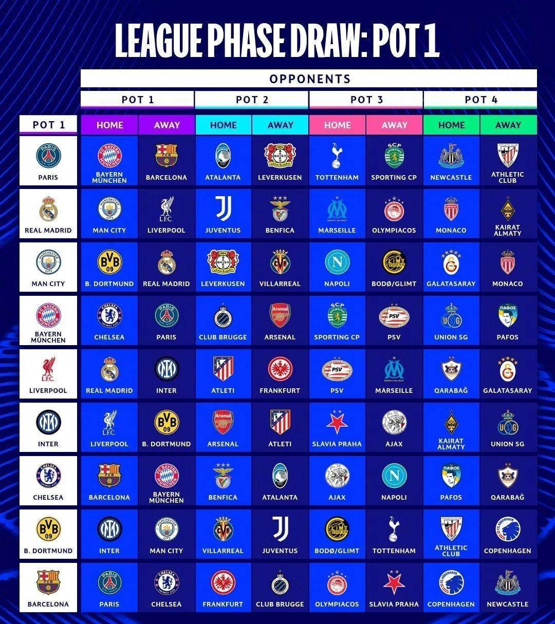 北京时间8月29号,2025/2026赛季欧洲冠军联赛首阶段抽签仪式公布啦。这是欧足联推出新赛制后的第二届比赛哦。36支参赛球队要按规定进行8轮联赛形式的比赛,然后竞争16强的名额。这次改革让比赛更有变数,球迷们都很期待呢。